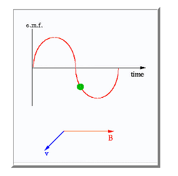As the loop rotates counter clockwise the bottom end moves up and the movement of the loop is now at an angle to the magnetic field. When the movement of the loop is at an angle to the magnetic field an e.m.f. is produced and an electrical current flows through the loop. At the point B the e.m.f produces a current that points out of the screen (at T the e.m.f produces a current pointing into the screen, since both ends of the loop are moving in opposite directions). As the loop moves counter clockwise it becomes aligned with the magnetic field and the movemement of the loop is now perpendicular to the field. At this point the emf becomes it largest and the current is its strongest. As the loop continues to rotate in the clockwise direction the movement becomes more aligned with the field and the emf and current gets smaller. When the loop is again in the vertical position with B at the top of the diagram the direction of rotation is aligned with the magnetic field and the emf and current drops to zero. The loop has rotated through 180 degrees.